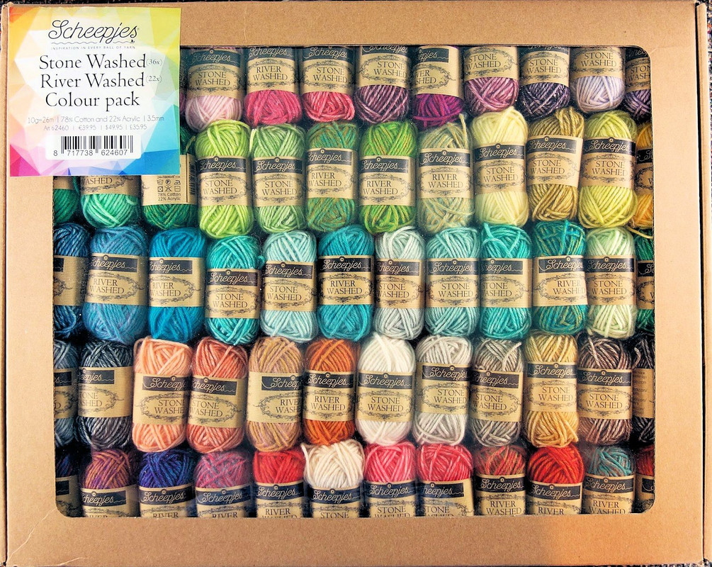 Een inspirerend cadeautje voor mezelf gekocht: een doos met 58 bolletje garen van 10 gram ieder. De samenstelling is 78% katoen x 22% Acryl, waardoor het lekker zacht aanvoelt, In de doos zitten 36 bolletjes van Scheepjes Stone Washed en 22 bolletjes Scheepjes River Washed: