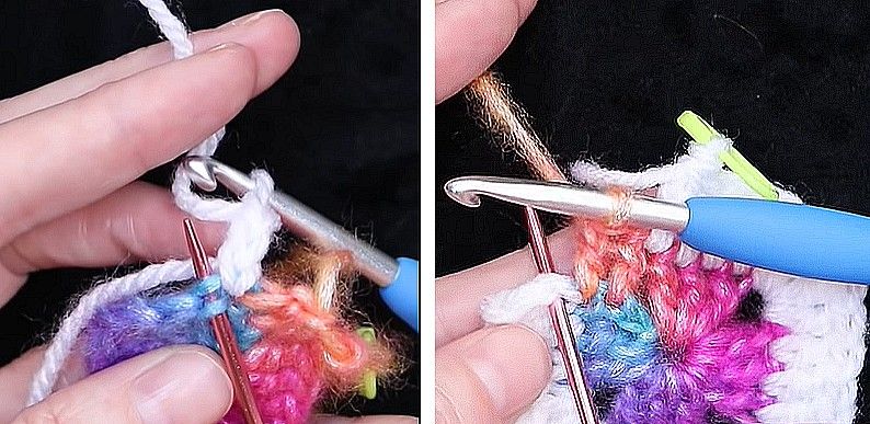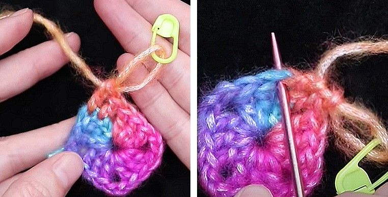 Dus vòòr het sluiten van de vierkant haak je met kleur A verder door 1 stokje in de eerste losse te haken en 1 stokje in de tweede losse (van de 3 lossen van de opzet):